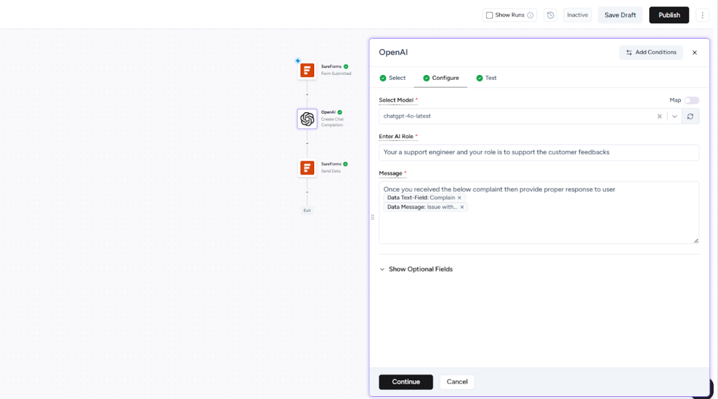 So, we’ll create a workflow in OttoKit where each time someone submits a SureForms form, their input is sent to OpenAI, a smart feedback message is generated, and the response is instantly displayed back to the user on the Thank You page.
