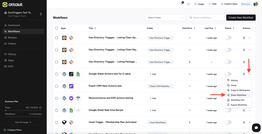 - Click on the three-dot menu of the workflow that you want to share and click on the “Share Workflow” option.