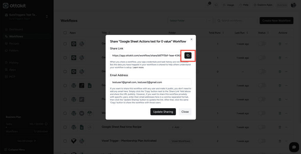 - Copy the URL by clicking on the copy icon, and you’re ready to share your workflow.