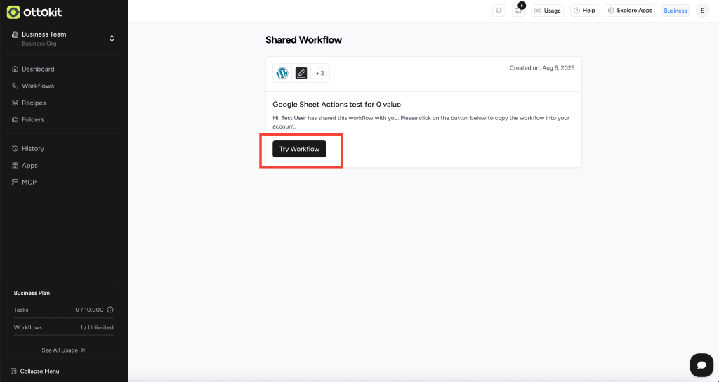 After signing up, when they access the workflow URL while being logged in, they can click on the “Try Workflow” button to create an identical clone of the workflow in their own account.