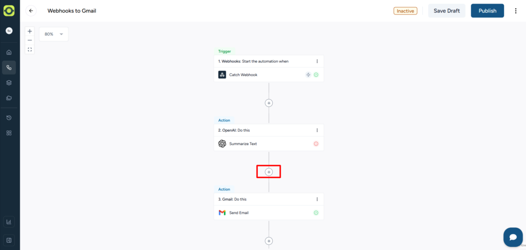 Step 2: Click anywhere on the plus icon and add an action step to the workflow