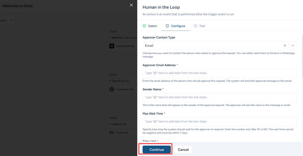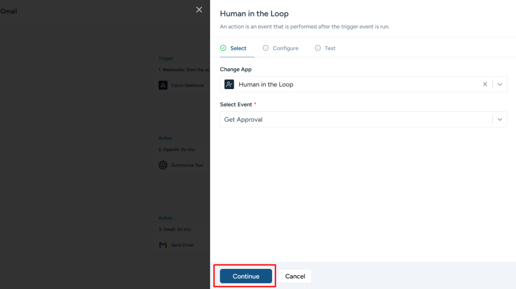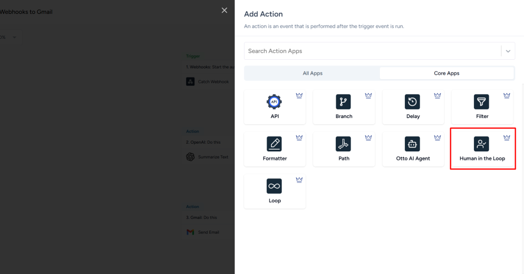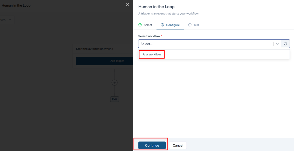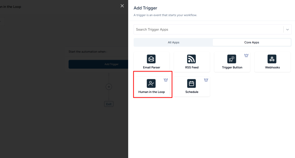 Step 2: Select Human in the Loop in the trigger step