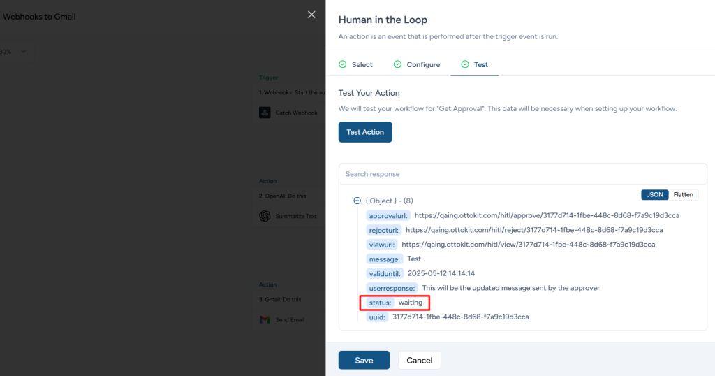 Step 6: Test the action, and you will get a waiting status.