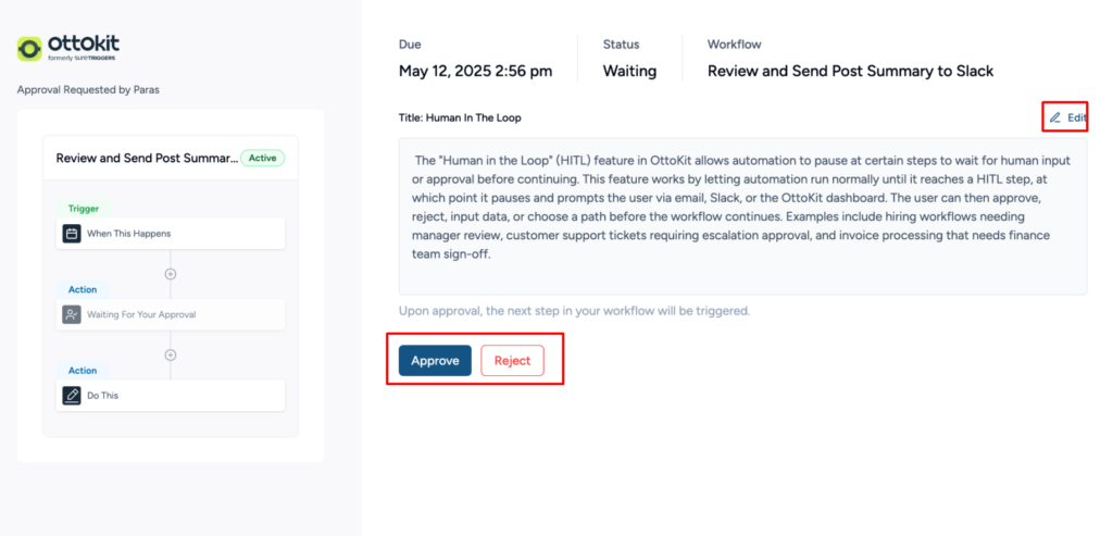 Human in the Loop is a core OttoKit feature that lets you add human approvals to any automated workflow.
