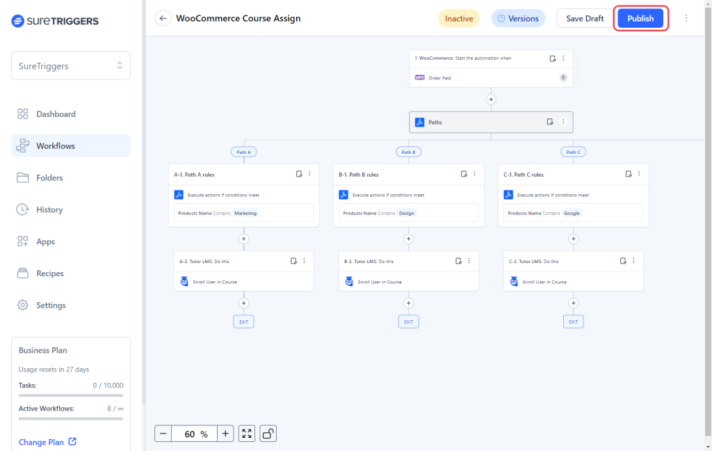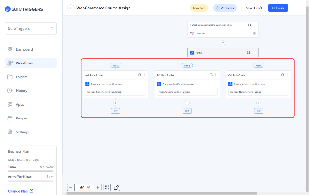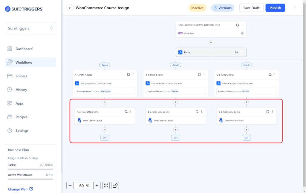 For example, if you’re selling three different courses on an ecommerce platform like WooCommerce and want to assign courses, in your LMS tool, to the buyer based on the plan they purchased, you don’t need to create three separate workflows.