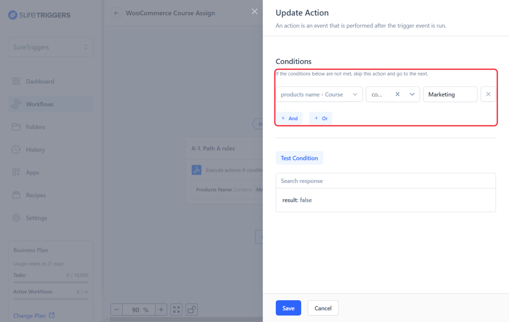 - Click on the first path step(A-1) and add conditions that define when the actions under this path should be executed. For example, only execute if the product name contains ‘Marketing’.