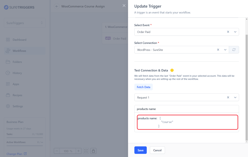 - Set up the trigger for WooCommerce. You can check for the product name in the response as we will use it as the criteria to divide the action paths further.