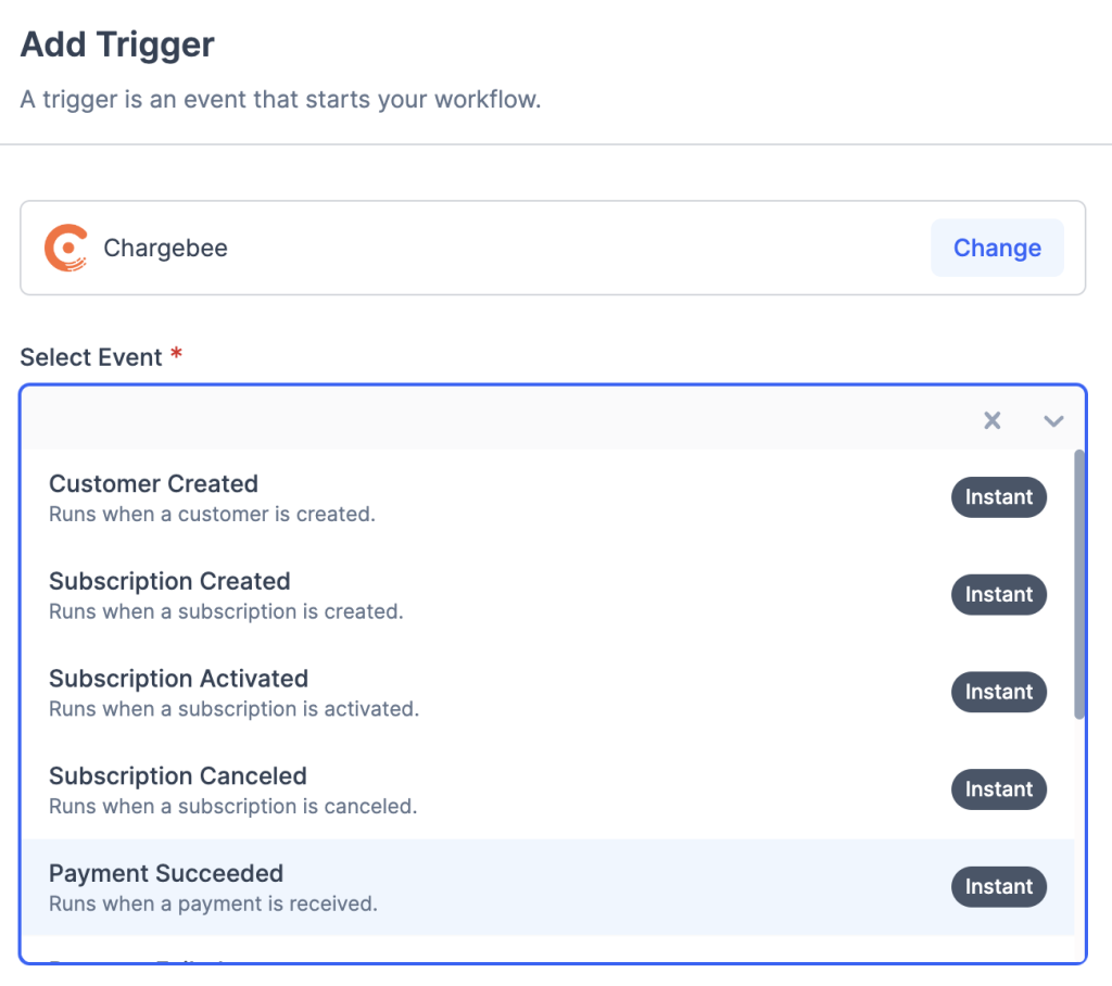We have added new triggers to the Chargebee integration, allowing you to initiate actions in other apps based on specific events in Chargebee.