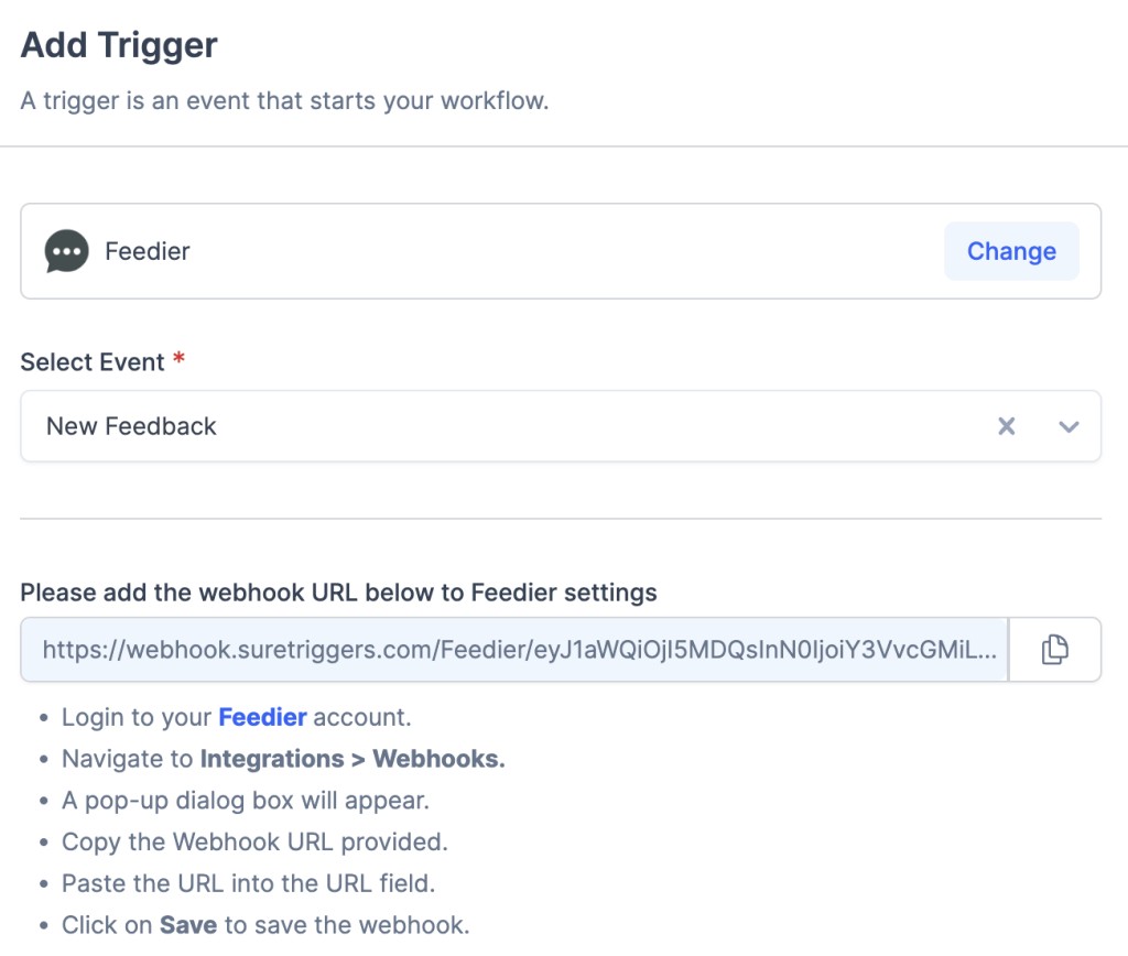 You can now create a workflow that automatically triggers when new feedback is received in Feedier. This integration allows you to capture feedback from your customers or users and seamlessly incorporate it into your existing workflows and systems.