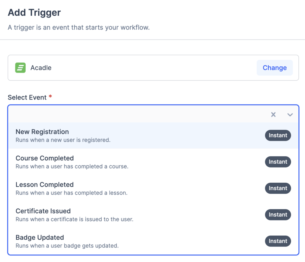 This integration allows educators to automate tasks and connect Acadle with various apps, enhancing their e-learning workflows.