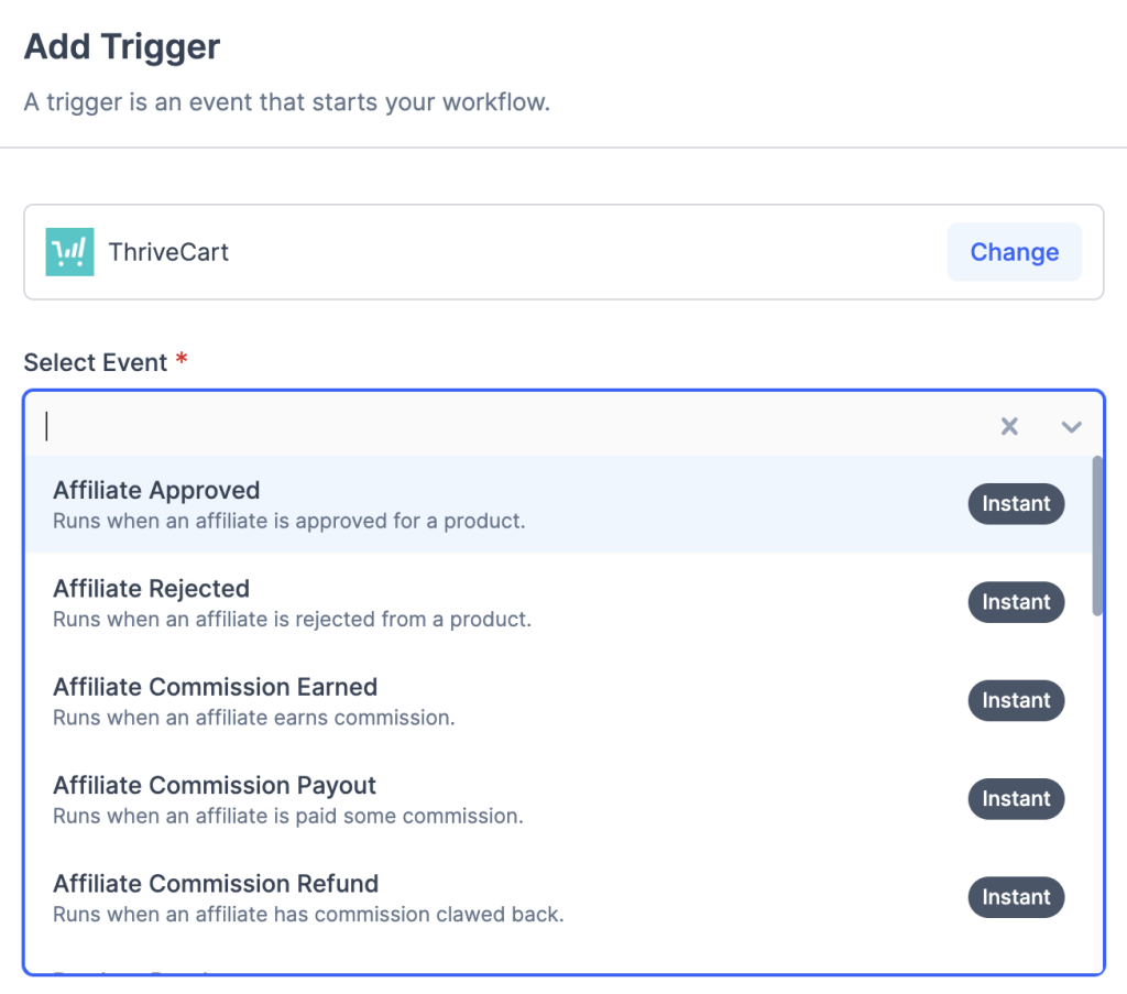 For e.g. When a new ThriveCart product is purchased add a user to the Mailchimp email list.
